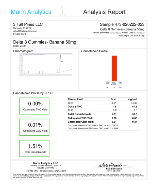 Ingredients: Sugar, corn syrup, fruit pectin, distilled water, Delta-8 THC, citric acid, potassium sorbate, baking soda, natural and artificial flavors